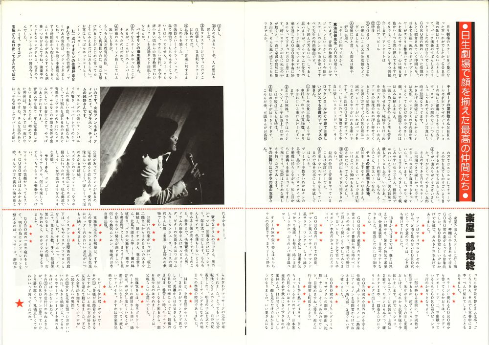 一部が終わる直前に、寺岡君が用意するもの、超アメリカンコーヒー、氷片が2ヶ入りの冷し麦茶、おしぼり、それから衣装を脱ぐ手伝いをします。汗でビッショリ、ちなみにステージ衣装は、上着は2着ずつ、ズボンは4本ずつ、蝶ネクタイ2本、一回着るたびにクリーニングに出します。